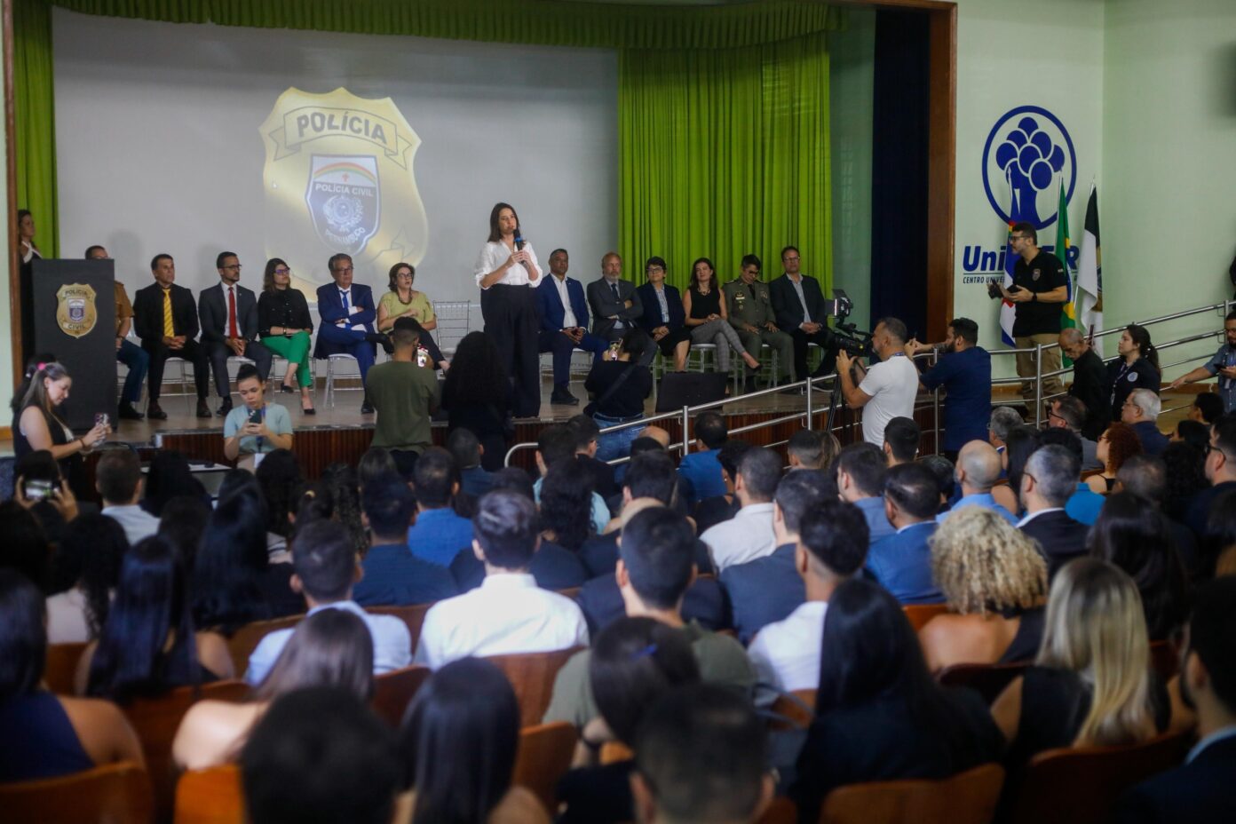 A governadora Raquel Lyra comandou, nesta segunda-feira (5), a abertura oficial do Curso de Formação Profissional para os aprovados no concurso da Polícia Civil de Pernambuco (PCPE). A cerimônia foi realizada no Centro Universitário Frassinetti do Recife (UniFAFIRE) e marcou o início da preparação de 445 futuros policiais civis entre delegados, agentes e escrivães que irão reforçar a segurança pública do Estado. A vice-governadora Priscila Krause também esteve presente na solenidade.