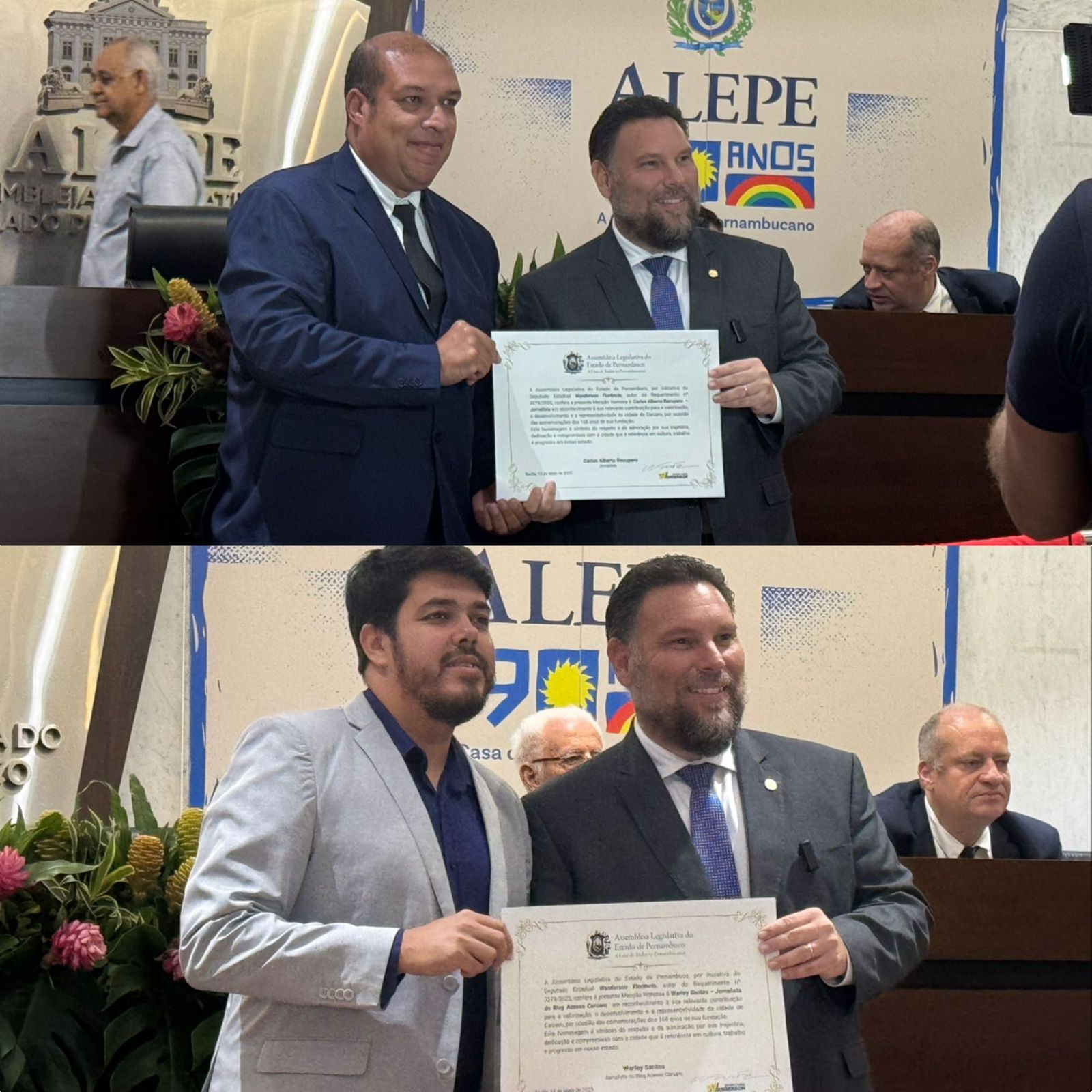 Na manhã desta quinta-feira (15), na Assembleia Legislativa de Pernambuco (Alepe), o portal Acessa Caruaru esteve na solenidade de homenagem aos 168 anos de Caruaru. Representado pelos seus editores, os jornalistas Carlos Recúpero e Warley Santos, o portal recebeu uma Menção Honrosa em reconhecimento à sua relevante contribuição para a valorização, o desenvolvimento e a representatividade no município de Caruaru.