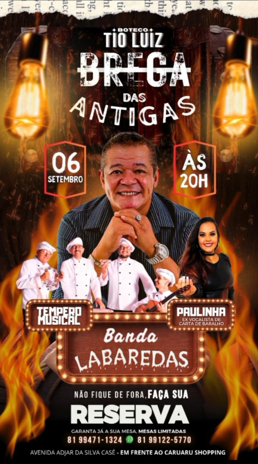 No próximo sábado (6), a partir das 20h30, o Boteco Tio Luiz será tomado pela nostalgia e pelo romantismo do verdadeiro brega raiz. A grande atração da noite é a consagrada Banda Labaredas, um dos maiores ícones do brega, trazendo sucessos que marcaram gerações como “Procure Me Esquecer”, “Minha Paixão” e “Kelly”. Vai ser impossível não cantar junto e se emocionar!