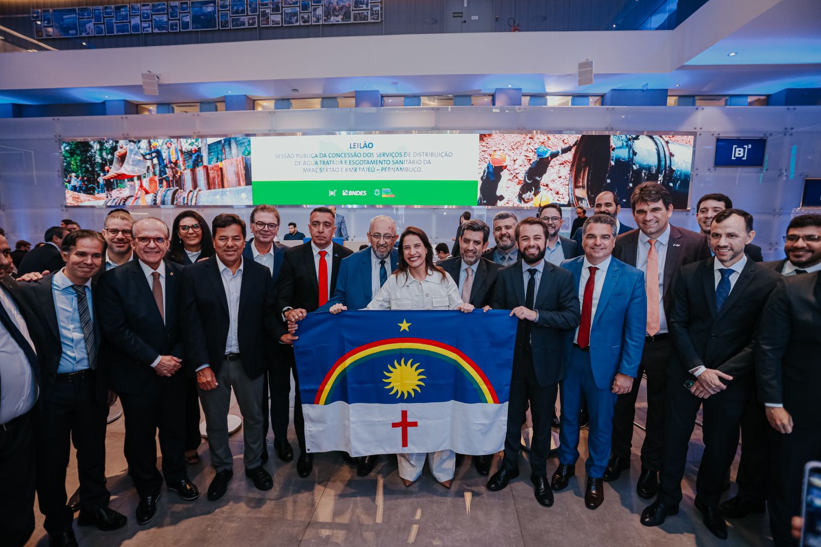 Sob a liderança da governadora Raquel Lyra, Pernambuco deu, nesta quinta-feira (18), um passo histórico rumo à universalização do saneamento básico, com a realização do leilão da concessão parcial dos serviços no Estado, realizado na B3, em São Paulo. Os grupos Consórcio Pernambuco Saneamento e a Pátria Investimentos, que apresentaram as propostas vencedoras, vão investir, juntos, R$ 19 bilhões na distribuição de água e na coleta e tratamento de esgoto, enquanto a Companhia Pernambucana de Saneamento (Compesa) continuará sendo responsável pela produção e tratamento de água. Além deste valor, foram levantados em outorgas R$ 4,2 bilhões, que serão destinados à universalização do saneamento e infraestrutura dos municípios, preferencialmente saneamento. A vice-governadora Priscila Krause também acompanhou a cerimônia.