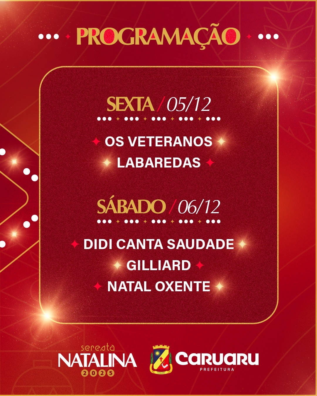 No sábado (6), a programação terá início às 19h, com os shows Didi canta Saudade, Gilliard e o espetáculo Natal Oxente, reunindo artistas como Fabiana Pimentinha, Nerilson Buscapé, Renilda Cardoso, Benil Ramos, João Carlos Baiano, Seu Januário e Kaká Cantarelli.