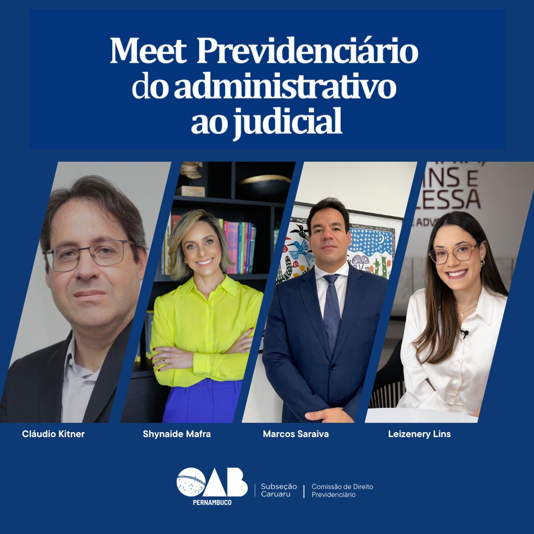 Na próxima quarta-feira (26), acontecerá o Meet Previdenciário – do Administrativo ao Judicial, evento realizado pela OAB Caruaru, por meio da Comissão de Direito Previdenciário. O encontro terá início às 14h, no auditório do Colégio Adventista.