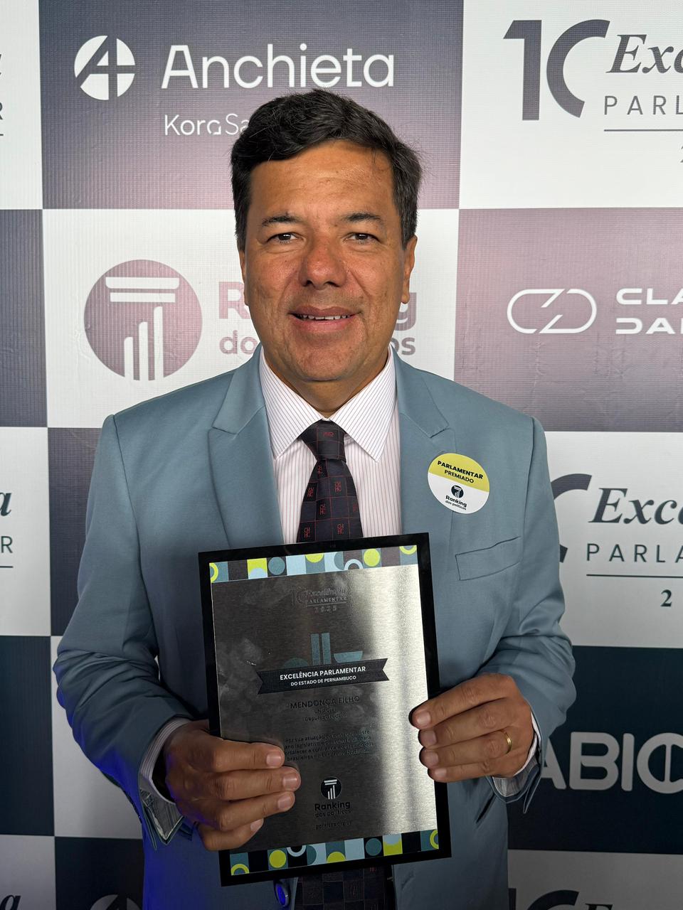 Nesta quarta-feira (10/12), o deputado federal, Mendonça Filho (União/PE), recebeu, em Brasília, a premiação *Excelência Parlamentar, do Ranking dos Políticos 2025,* como o 2º melhor desempenho parlamentar do Brasil, o 1º lugar do Nordeste e o 1º lugar de Pernambuco, consolidando sua posição entre as principais lideranças do Congresso Nacional. Mendonça Filho encerra 2025 sendo reconhecido como um dos parlamentares de melhor atuação no Brasil por rankings nacionais *Os 100 Cabeças do Congresso, do Diap* , e o *Valoriza Parlamento* , do Esfera Brasil. “Política se faz com compromisso, coragem e resultados. Tenho me dedicado a enfrentar desafios importantes e defender avanços que transforme o dia a dia do cidadão”, afirmou Mendonça Filho.