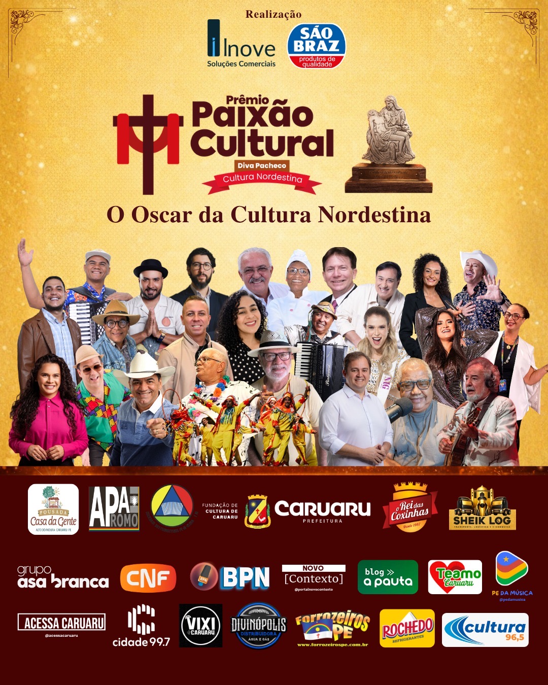 Considerado o “Oscar da Cultura Nordestina”, o prêmio — criado em 2013 por Júlio Leal (APA-PE) — homenageia personalidades que se destacam na preservação e difusão da arte regional. Este ano, a lista de laureados reflete a diversidade do Nordeste, unindo lendas do forró, novos talentos e expoentes das artes cênicas e gastronomia.