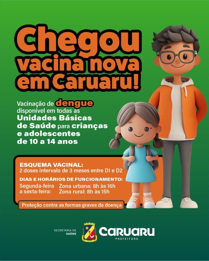 A Prefeitura de Caruaru, por meio da Secretaria Municipal de Saúde, iniciou, nesta segunda-feira (09), a vacinação contra a dengue no município para crianças e adolescentes de 10 a 14 anos, conforme ampliação da estratégia definida pelo Ministério da Saúde. A imunização ocorre nas Unidades Básicas de Saúde, com horário das 8h às 16h na zona urbana e das 8h às 15h na zona rural, fortalecendo a prevenção e reduzindo o risco de casos graves da doença.