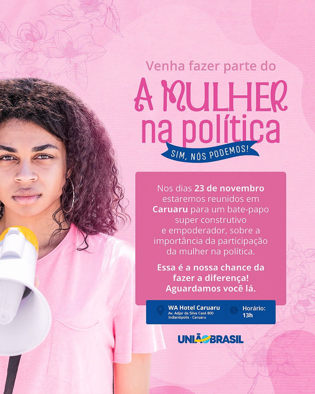 O União Brasil Mulher Pernambuco realizará em Caruaru nesta quinta-feira (23) o encontro “A Mulher na política”. O evento ocorrerá no WA Hotel Caruaru, a partir das 13h.